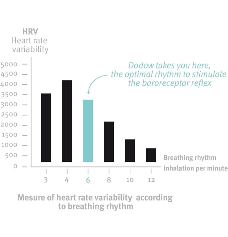 Il grafico mostra un vero e proprio incremento della HRV (heart rate variability) a partire da 6 respirazioni al minuto (maggiore è la HRV, più i ritmi cardiaci variano in modo fluido - in contrapposizione a una variazione irregolare - segno di un'attività autonomica parasimpatica dominante). Per ragioni di semplicità d'utilizzo, abbiamo deciso di non scendere al di sotto delle 6 respirazioni al minuto.