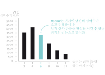 이 그래프는 분당 6번의 호흡률을 적용했을 때 심박변이 (HRV)에 변화를 가져오는 것을 나타냅니다 (HRV가 높을 수록 심장 리듬에 더 부드러운 변화를 가져오는데, 이는 비교감 신경계의 활성화를 나타냅니다). 제품의 사용성을 높이기 위해 저희는 분당 6번 이하로는 제품이 작동하지 않도록 했습니다.